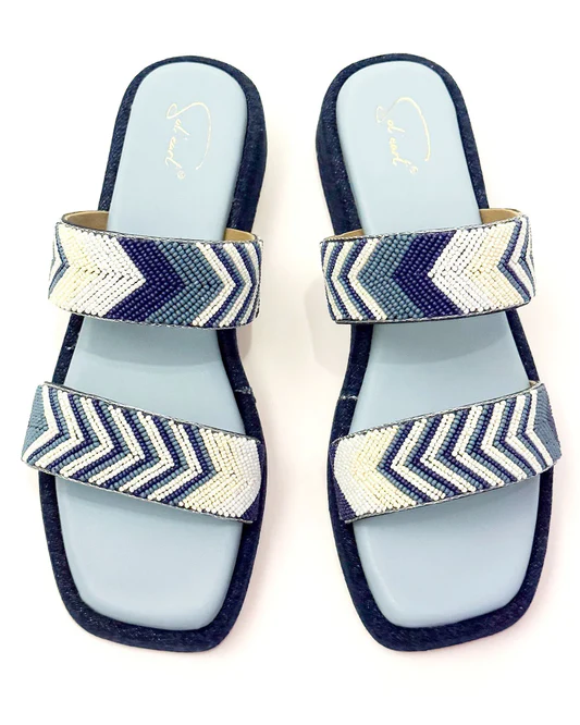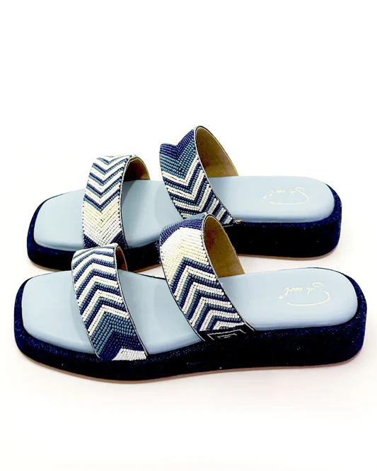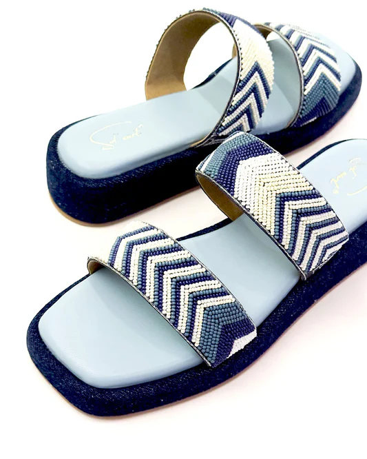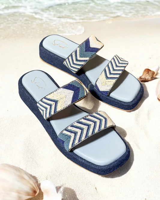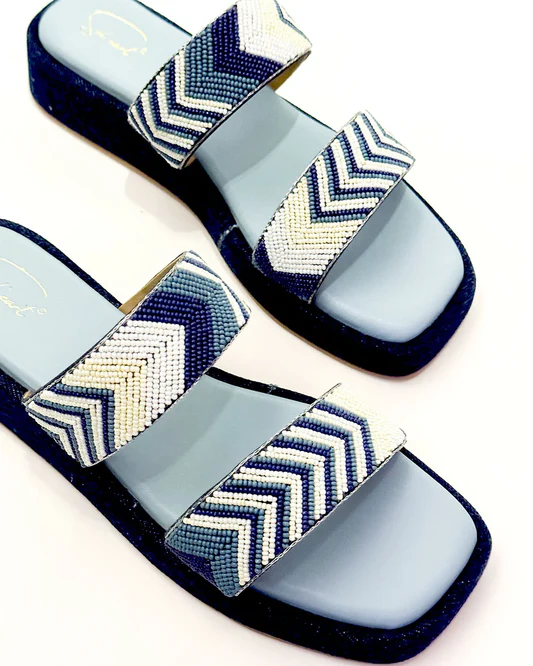 Say hello to Coachella, your ultimate festival-ready flatforms. With a cool denim base and two intricately beaded straps in shades of blue, white, and off-white, these heels bring effortless boho-chic energy to any look. The geometric beadwork adds a playful touch, while the comfy platform keeps you dancing from day to night.