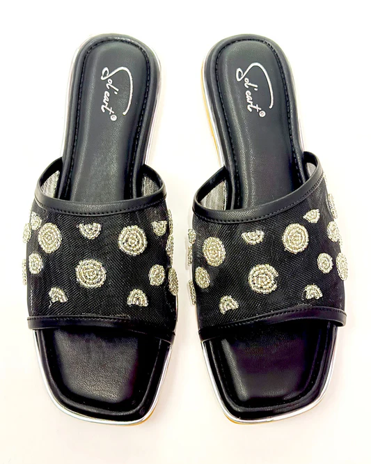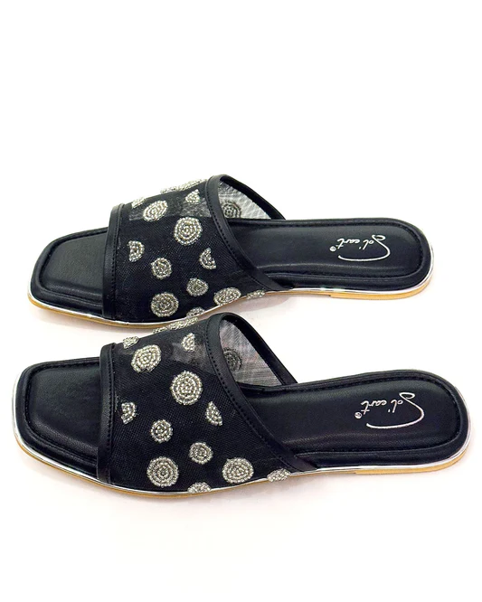 Sophisticated with a hint of sass, the Lady Dot Black sliders redefine casual glam. The sheer mesh upper paired with intricate gold beaded circles adds just the right amount of shine to your everyday looks. Easy to wear and impossible to ignore and your go-to for laid-back elegance.