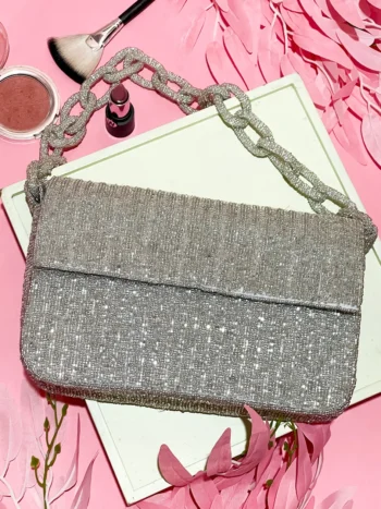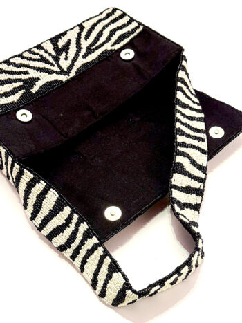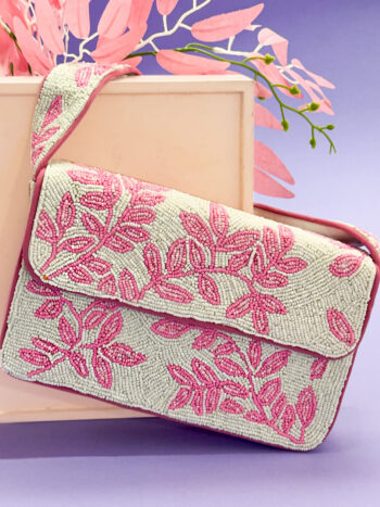 Designed in a striking geometric silhouette, this statement piece is meticulously hand-beaded in a stunning mix of metallic shades: gleaming gold, soft white, rich bronze, romantic rose gold, and sleek silver.