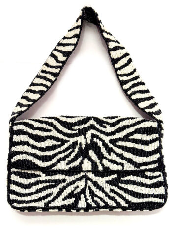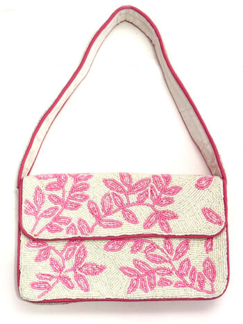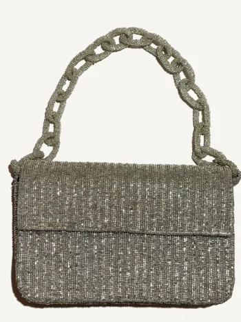 Designed in a striking geometric silhouette, this statement piece is meticulously hand-beaded in a stunning mix of metallic shades: gleaming gold, soft white, rich bronze, romantic rose gold, and sleek silver.