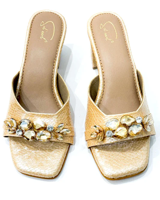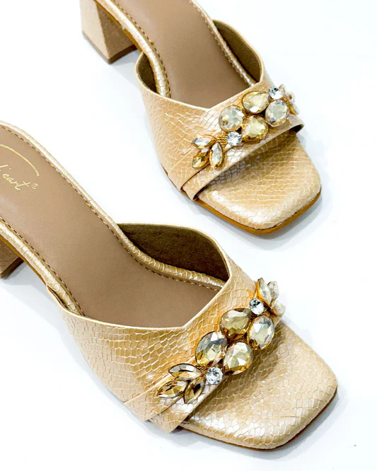 Step into brilliance with Radiant Luxe, a gold heel that lives up to its name. Its textured surface glimmers under every light, while gold and silver crystals are meticulously encrusted to create a dazzling two-tone shimmer. Bold, glamorous, and commanding, this pair is made for evenings that demand a show-stopping entrance.